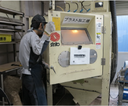 小ロットに適した手動のブラスト機と、省力化と品質の安定のための自動化を実現したブラスト機で表面処理加工を行います。また複数の材質や表現に対応できるようにアルミナ、ガラスビーズ等のメディアを準備しています。