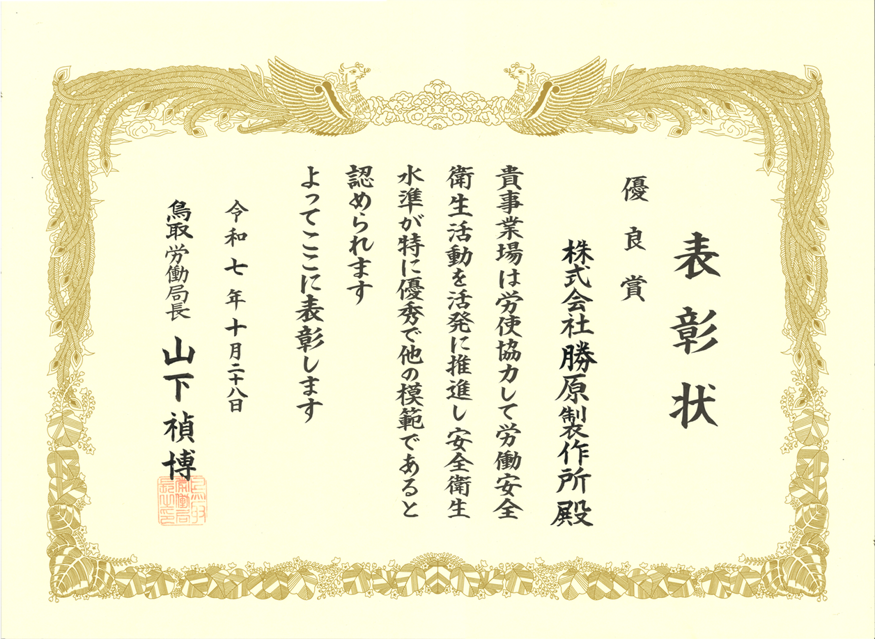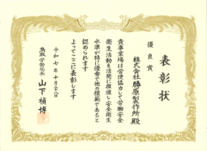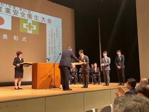 2025年10月28日社外行事 鳥取労働局長より、労働安全衛生に係る優良事業場として表彰を受けました! とりぎん文化会館において開催された鳥取県産業衛生大会で、 「安全衛生成績が極めて高い水準に達し、他の模範と認められる事業場である」と認められ、表彰されました。 日頃より高い安全意識を持ちながら業務に取り組んでいる、社員一人ひとりの努力の賜物と考えています。 今回の結果に慢心せず、今後も他の模範であり続けられるよう、 ルールの整備や意識向上に向けて邁進していきます。 (安全衛生委員会)